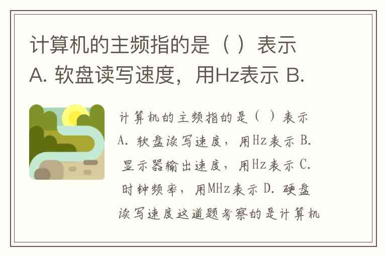 计算机的主频指的是( )表示 A. 软盘读写速度,用Hz表示 B. 显示器输出速度,用Hz表示 C. 时钟频率,用MHz表示 D. 硬盘读写速度