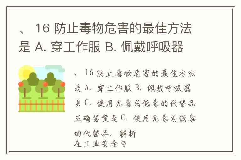 、 16 防止毒物危害的最佳方法是 A. 穿工作服 B. 佩戴呼吸器具 C. 使用无毒或低毒的代替品