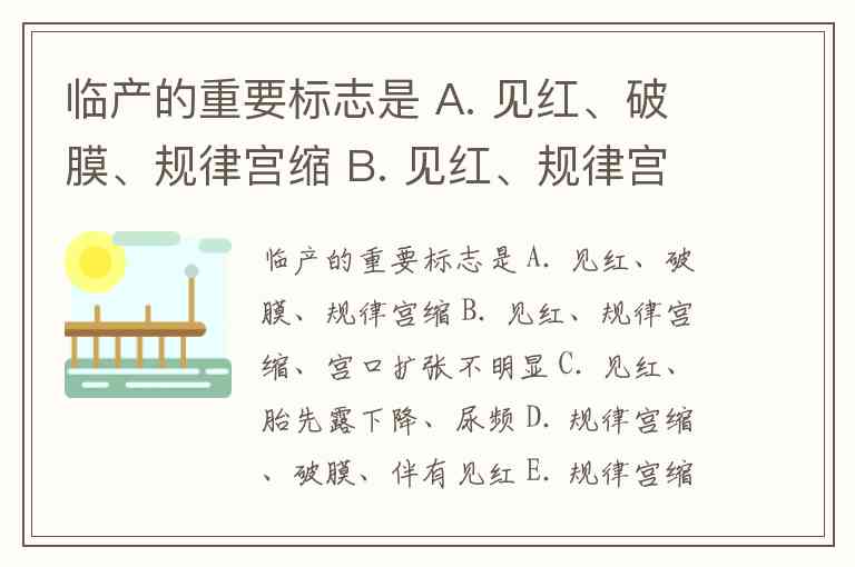 临产的重要标志是 A. 见红、破膜、规律宫缩 B. 见红、规律宫缩、宫口扩张不明显 C. 见红、胎先露下降、尿频 D. 规律宫缩、破膜、伴有见红 E. 规律宫缩逐渐增强、伴随宫口进行性扩张和胎先露下降