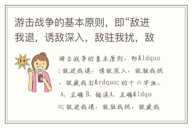 游击战争的基本原则,即“敌进我退,诱敌深入,敌驻我扰,敌疲我打”的十六字诀。 A. 正确 B. 错误