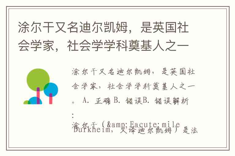 涂尔干又名迪尔凯姆,是英国社会学家,社会学学科奠基人之一。 A. 正确 B. 错误