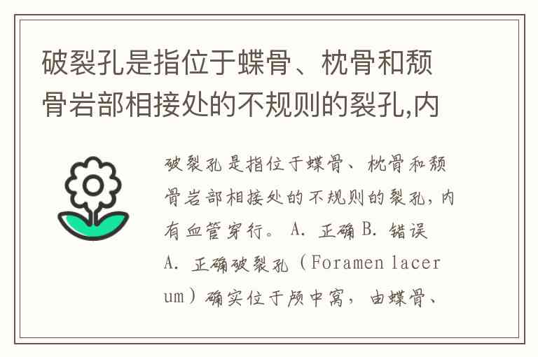 破裂孔是指位于蝶骨、枕骨和颓骨岩部相接处的不规则的裂孔,内有血管穿行。 A. 正确 B. 错误