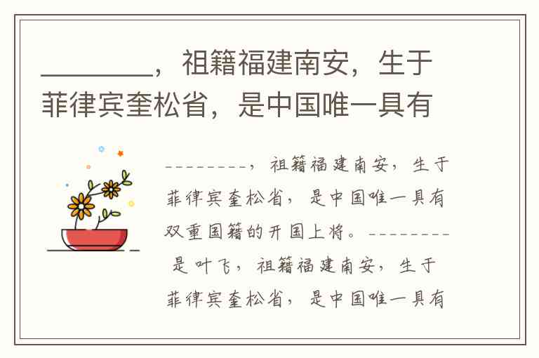 ________ 是 叶飞,祖籍福建南安,生于菲律宾奎松省,是中国唯一具有双重国籍的开国上将。