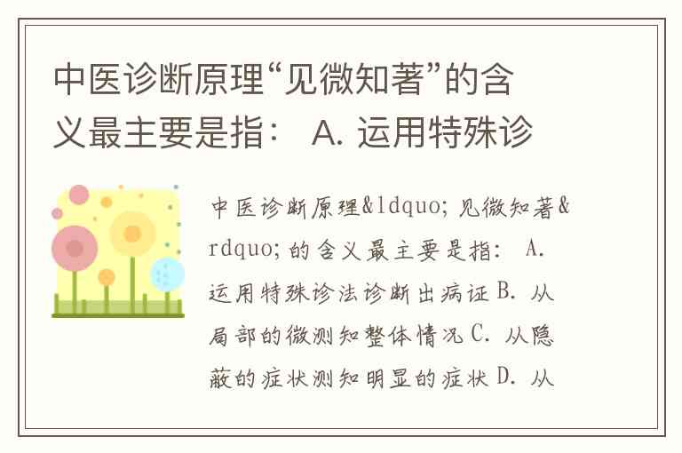 中医诊断原理“见微知著”的含义最主要是指: A. 运用特殊诊法诊断出病证 B. 从局部的微测知整体情况 C. 从隐蔽的症状测知明显的症状 D. 从易忽略的体征中求得病情 E. 认识正常的来辨别异常的病理情况