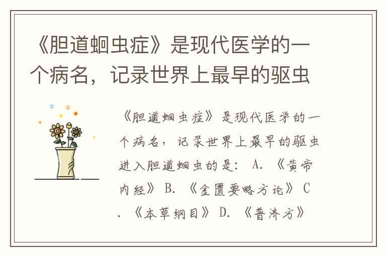 《胆道蛔虫症》是现代医学的一个病名,记录世界上最早的驱虫进入胆道蛔虫的是: A. 《黄帝内经》 B. 《金匮要略方论》 C. 《本草纲目》 D. 《普济方》