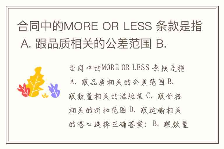 合同中的MORE OR LESS 条款是指 A. 跟品质相关的公差范围 B. 跟数量相关的溢短装 C. 跟价格相关的折扣范围 D. 跟运输相关的港口选择