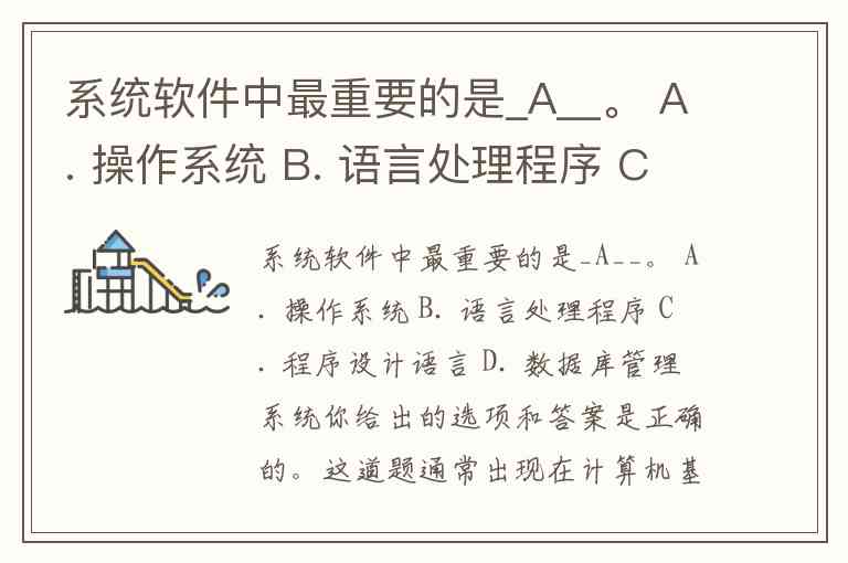 系统软件中最重要的是_A__。 A. 操作系统 B. 语言处理程序 C. 程序设计语言 D. 数据库管理系统