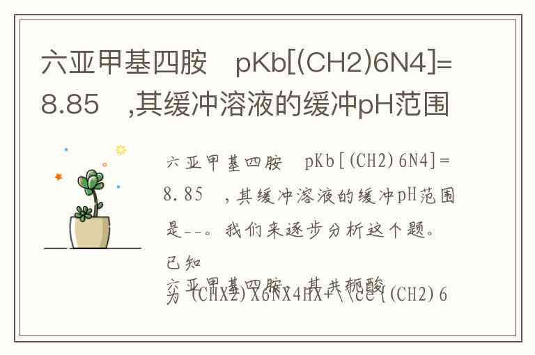 六亚甲基四胺pKb[(CH2)6N4]=8.85,其缓冲溶液的缓冲pH范围是__。