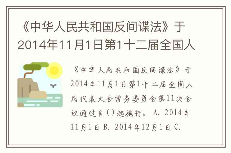 《中华人民共和国反间谍法》于2014年11月1日第1十二届全国人民代表大会常务委员会第11次会议通过自( )起施行。 A. 2014年11月1日 B. 2014年12月1日 C. 2015年11月1日 D. 2015年12月1日