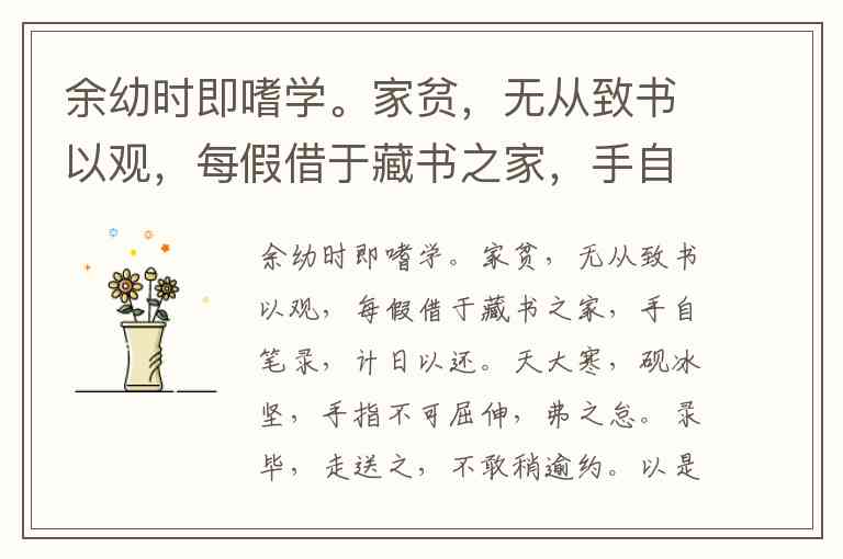 余幼时即嗜学。家贫,无从致书以观,每假借于藏书之家,手自笔录,计日以还。天大寒,砚冰坚,手指不可屈伸,弗之怠。录毕,走送之,不敢稍逾约。以是人多以书假余,余因得遍观群书。既加冠,益慕圣贤之道,又患无砚师、名人与游,尝趋百里外,从乡之先达执经叩问。先达德隆望尊,门人弟子填其室,未尝稍降辞色。余立侍左右,援疑质理,俯身倾耳以请;或遇其叱咄,色愈恭,礼愈至,不敢出一言以复;俟其欣悦,则又请焉。故余虽愚,卒获有所闻。 (节选自宋濂《送东阳马生序》) 17、解释下列句子中加点的词。 (1)弗之怠 (2)走送之 (3)未尝稍降辞色 (4)俟其欣悦 18、对下列句子中加点的“之”理解错误的一项是(▲ )。 A.每假借于藏书之家(的) B.弗之怠(指代抄书) C.走送之(指代藏书之家) D.益慕圣贤之道(的) 19、用现代汉语写出下列句子的意思。 (1)以是人多以书假余。 (2)故余虽愚,卒获有所闻。 20、读了这段文字,你觉得宋濂有哪些品质值得学习?