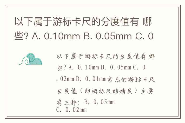 以下属于游标卡尺的分度值有 哪些? A. 0.10mm B. 0.05mm C. 0.02mm D. 0.01mm