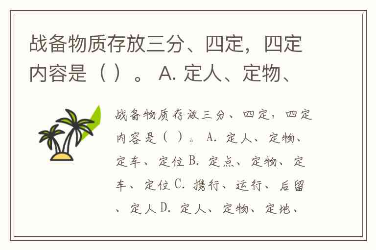 战备物质存放三分、四定,四定内容是( )。 A. 定人、定物、定车、定位 B. 定点、定物、定车、定位 C. 携行、运行、后留、定人 D. 定人、定物、定地、定点