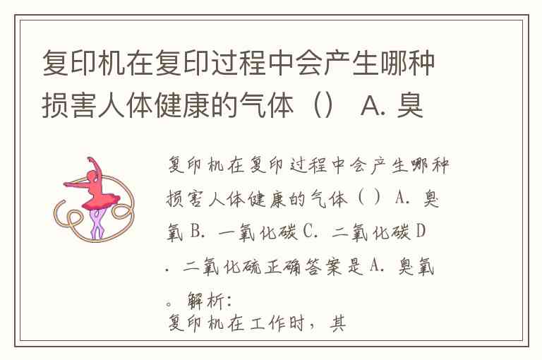 复印机在复印过程中会产生哪种损害人体健康的气体() A. 臭氧 B. 一氧化碳 C. 二氧化碳 D. 二氧化硫