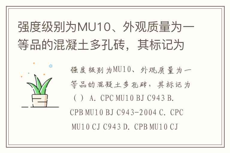 强度级别为MU10、外观质量为一等品的混凝土多孔砖,其标记为() A. CPC MU10 BJ C943 B. CPB MU10 BJ C943-2004 C. CPC MU10 CJ C943 D. CPB MU10 CJ C943-2004
