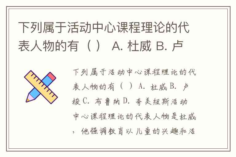 下列属于活动中心课程理论的代表人物的有( ) A. 杜威 B. 卢梭 C. 布鲁纳 D. 夸美纽斯