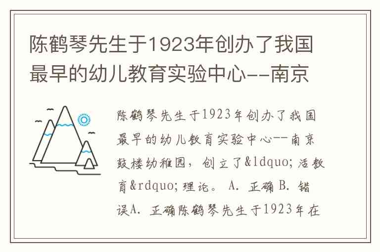 陈鹤琴先生于1923年创办了我国最早的幼儿教育实验中心--南京鼓楼幼稚园,创立了“活教育”理论。 A. 正确 B. 错误