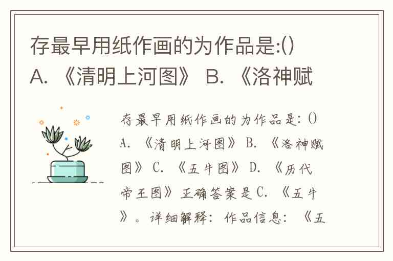 存最早用纸作画的为作品是:() A. 《清明上河图》 B. 《洛神赋图》 C. 《五牛图》 D. 《历代帝王图》