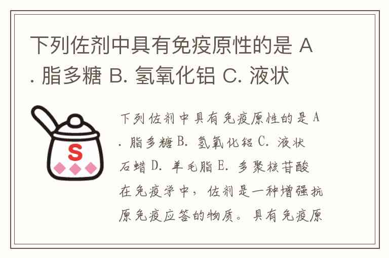 下列佐剂中具有免疫原性的是 A. 脂多糖 B. 氢氧化铝 C. 液状石蜡 D. 羊毛脂 E. 多聚核苷酸