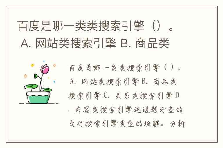 百度是哪一类类搜索引擎()。 A. 网站类搜索引擎 B. 商品类搜索引擎 C. 关系类搜索引擎 D. 内容类搜索引擎