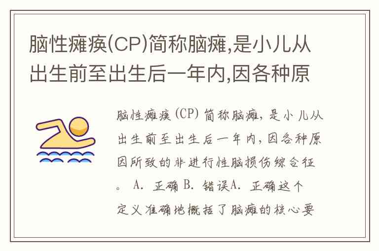 脑性瘫痪(CP)简称脑瘫,是小儿从出生前至出生后一年内,因各种原因所致的非进行性脑损伤综合征。 A. 正确 B. 错误