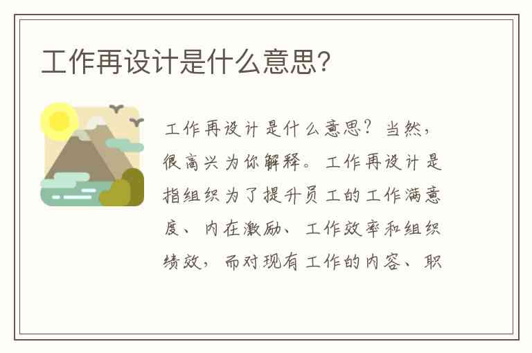工作再设计是指组织为了提升员工的工作满意度、内在激励、工作效率和组织绩效,而对现有工作的内容、职责、方式、权责关系进行系统性的重新规划和改变的过程。