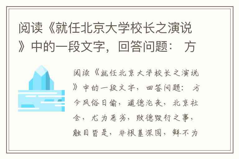阅读《就任北京大学校长之演说》中的一段文字,回答问题: 方今风俗日偷,道德沦丧,北京社会,尤为恶劣,败德毁行之事,触目皆是,非根基深固,鲜不为流俗所染。诸君肄业大学,当能束身自爱。然国家之兴替,视风俗之厚薄。流俗如此,前途何堪设想。故必有卓绝之士,以身作则,力矫颓俗。诸君为大学学生,地位甚高,肩此重任,责无旁贷,故诸君不惟思所以感己,更必有以励人。 A. 这段文字论述的论题是什么? B. 这段文字对北大学生提出了什么要求? C. 说明这段文字的语言特点。