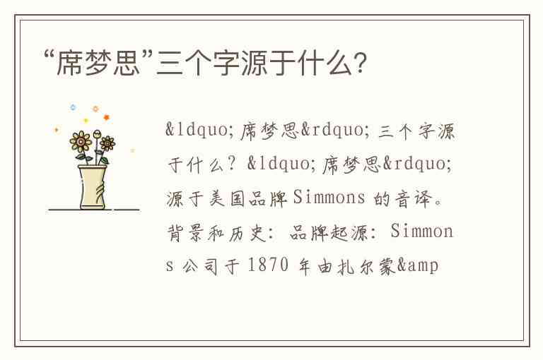 音译得名:20 世纪初,Simmons 产品进入中国市场,因其舒适度和高端定位深受欢迎。中文名“席梦思”既音译自“Simmons”,又巧妙结合了“席”(床席)和“梦思”(梦的思绪),贴合产品属性。