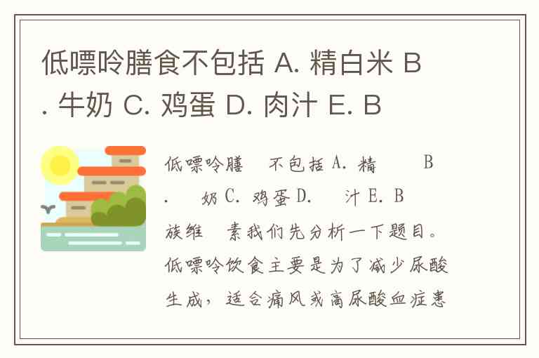 低嘌呤膳⻝不包括 A. 精⽩⽶ B. ⽜奶 C. 鸡蛋 D. ⾁汁 E. B 族维⽣素
