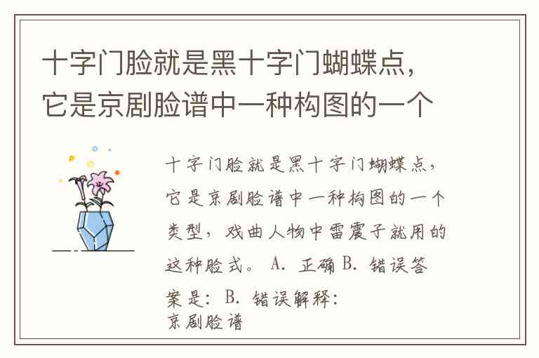 十字门脸就是黑十字门蝴蝶点,它是京剧脸谱中一种构图的一个类型,戏曲人物中雷震子就用的这种脸式。 A. 正确 B. 错误