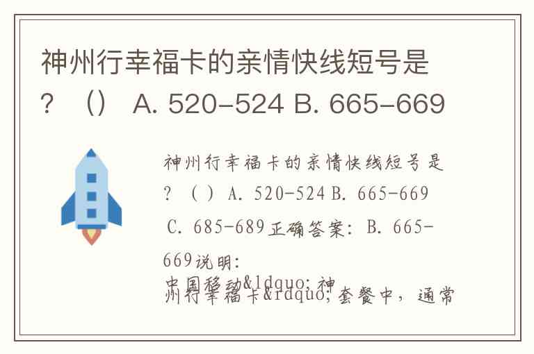 神州行幸福卡的亲情快线短号是?() A. 520-524 B. 665-669 C. 685-689