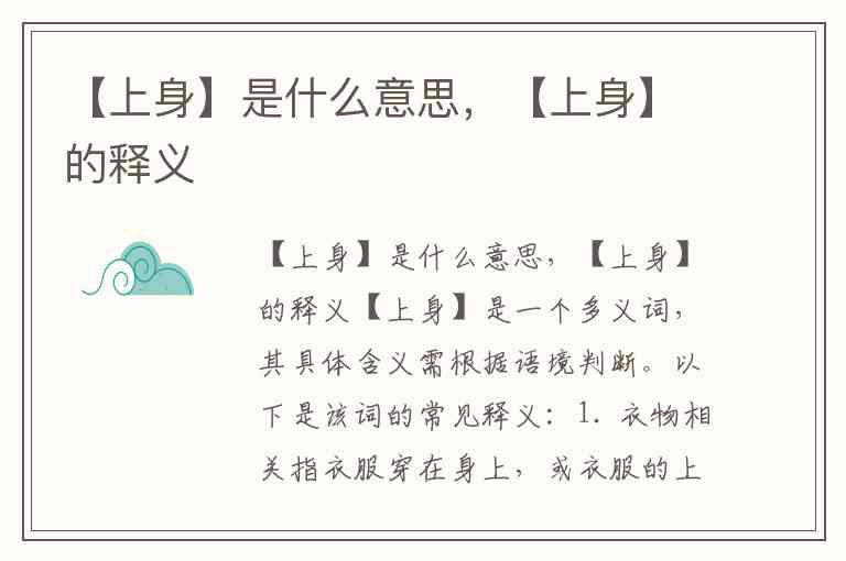 【上身】是一个多义词,其具体含义需根据语境判断。以下是该词的常见释义: