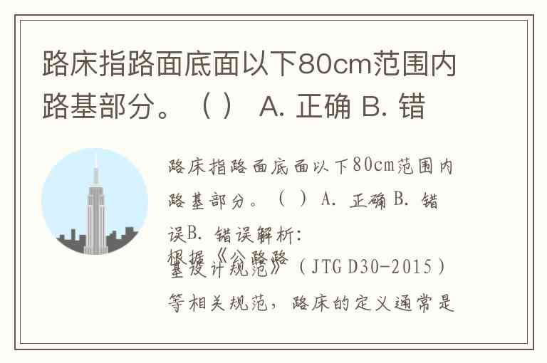 题干将路床笼统地定义为“路面底面以下80cm范围内”,未区分公路等级和实际情况,因此表述不准确。