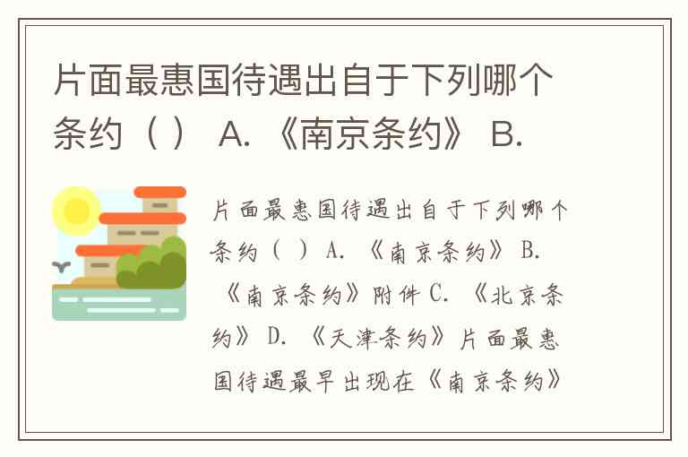 片面最惠国待遇出自于下列哪个条约( ) A. 《南京条约》 B. 《南京条约》附件 C. 《北京条约》 D. 《天津条约》