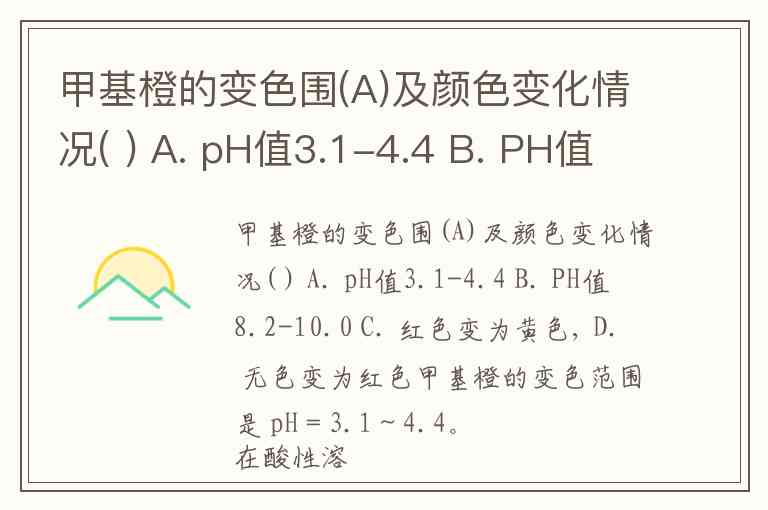 甲基橙的变色围(A)及颜色变化情况( ) A. pH值3.1-4.4 B. PH值8.2-10.0 C. 红色变为黄色, D. 无色变为红色