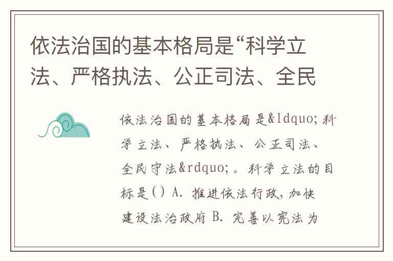依法治国的基本格局是“科学立法、严格执法、公正司法、全民守法”。科学立法的目标是( ) A. 推进依法行政,加快建设法治政府 B. 完善以宪法为核心的中国特色社会主义法律体系 C. 加强宪法实施 D. 增强全民法治观念,推进法治社会建设