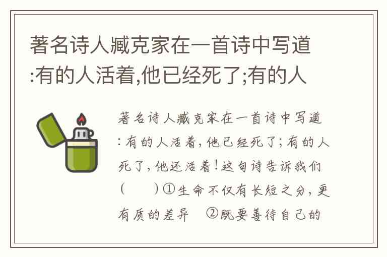 著名诗人臧克家在一首诗中写道:有的人活着,他已经死了;有的人死了,他还活着!这句诗告诉我们( )①生命不仅有长短之分,更有质的差异 ②既要善待自己的生命,也要善待他人的生命 ③人生的意义在于能够活出自己,处处为自己着想 ④每个人的生活不尽相同,人生意义也不同 A. ①②③④ B. ②③④ C. ①④ D. ①②③