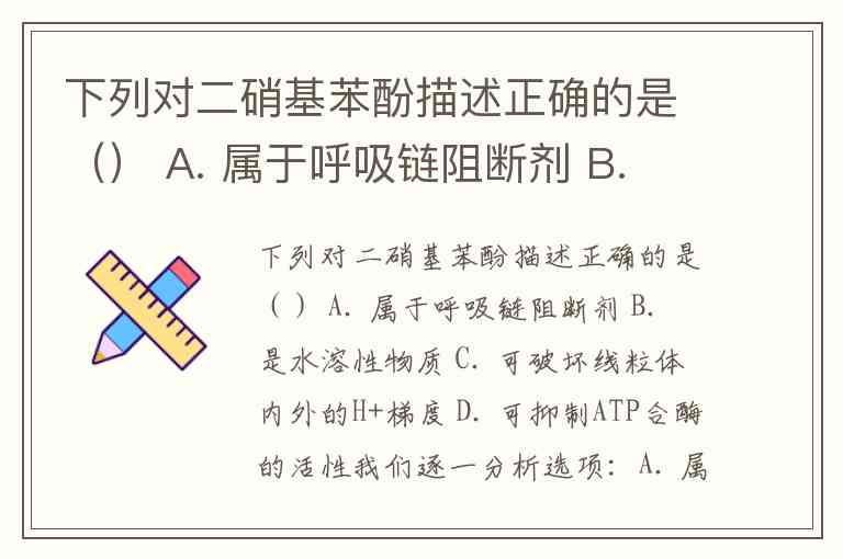 下列对二硝基苯酚描述正确的是() A. 属于呼吸链阻断剂 B. 是水溶性物质 C. 可破坏线粒体内外的H+梯度 D. 可抑制ATP合酶的活性