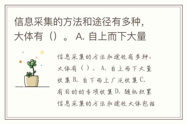 信息采集的方法和途径有多种,大体有()。 A. 自上而下大量收集 B. 自下而上广泛收集 C. 有目的的专项收集 D. 随机积累