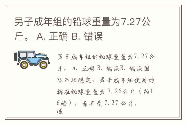 男子成年组的铅球重量为7.27公斤。 A. 正确 B. 错误
