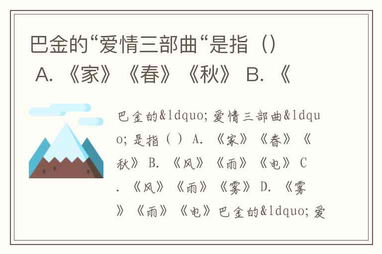 巴金的“爱情三部曲“是指() A. 《家》《春》《秋》 B. 《风》《雨》《电》 C. 《风》《雨》《雾》 D. 《雾》《雨》《电》