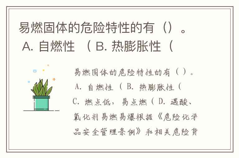 易燃固体的危险特性的有()。 A. 自燃性 ( B. 热膨胀性( C. 燃点低,易点燃( D. 遇酸、氧化剂易燃易爆