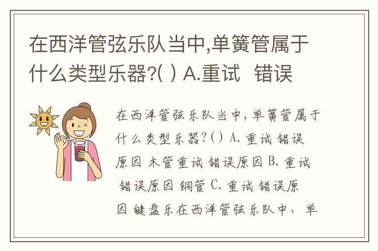在西洋管弦乐队当中,单簧管属于什么类型乐器?( ) A.重试 错误原因 木管重试 错误原因 B.重试 错误原因 铜管 C.重试 错误原因 键盘乐