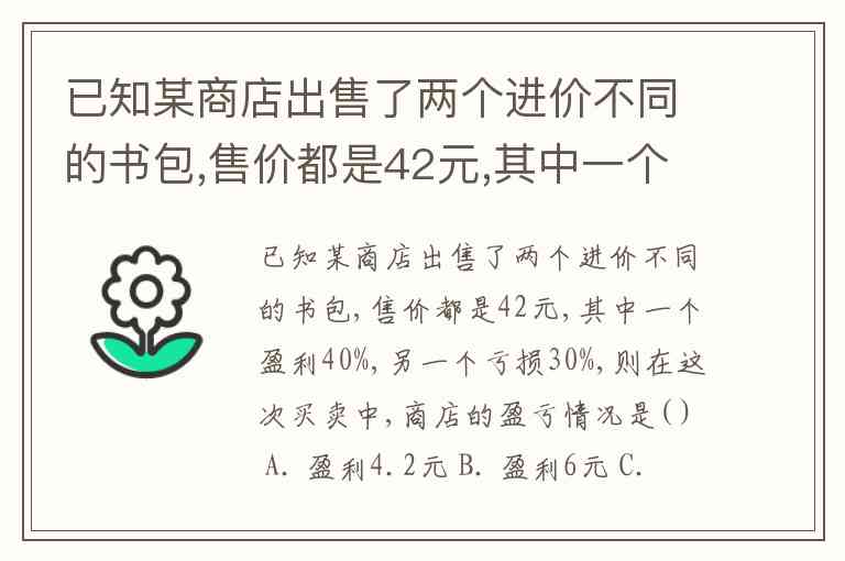 已知某商店出售了两个进价不同的书包,售价都是42元,其中一个盈利40%,另一个亏损30%,则在这次买卖中,商店的盈亏情况是( ) A. 盈利4.2元 B. 盈利6元 C. 不盈不亏 D. 亏损6元