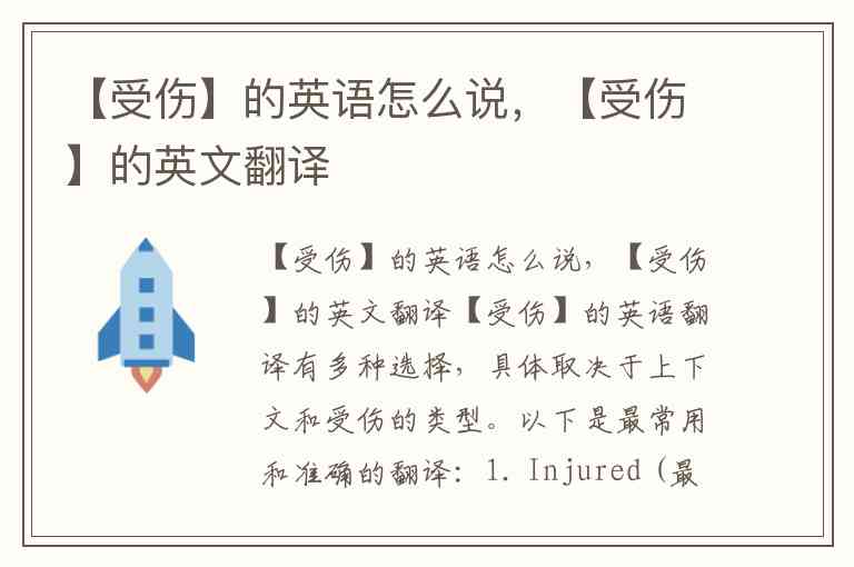 【受伤】的英语翻译有多种选择,具体取决于上下文和受伤的类型。以下是最常用和准确的翻译: