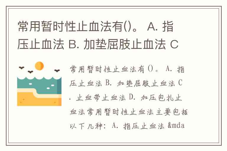 常用暂时性止血法有()。 A. 指压止血法 B. 加垫屈肢止血法 C. 止血带止血法 D. 加压包扎止血法