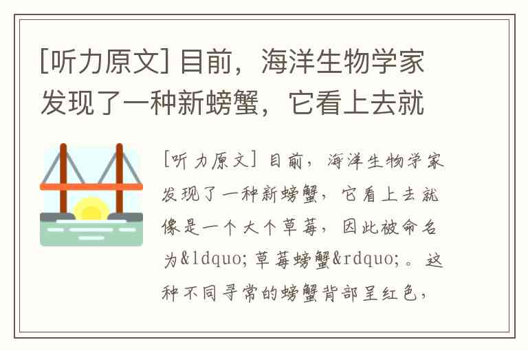 [听力原文] 目前,海洋生物学家发现了一种新螃蟹,它看上去就像是一个大个草莓,因此被命名为“草莓螃蟹”。这种不同寻常的螃蟹背部呈红色,并且有许多白色小圆点相间。草莓螃蟹的直径仅有2.5厘米宽,它们看上去与其他种类的螃蟹截然不同。() A. 草莓螃蟹宽25厘米 B. 草莓螃蟹喜欢吃草莓 C. 草莓螃蟹背上有红点 D. 草莓螃蟹长得像草莓