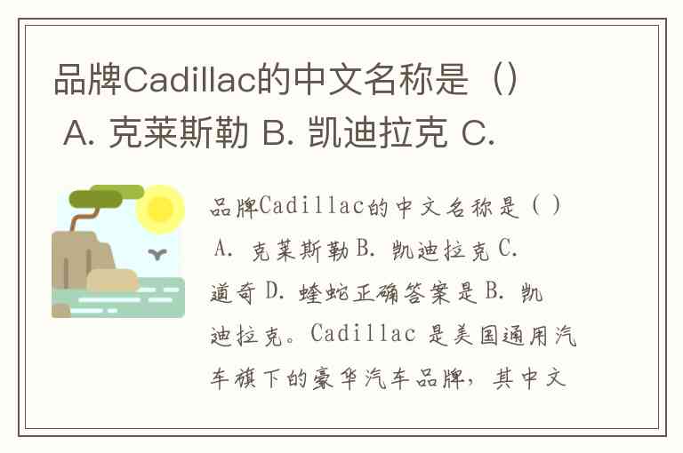 品牌Cadillac的中文名称是() A. 克莱斯勒 B. 凯迪拉克 C. 道奇 D. 蝰蛇
