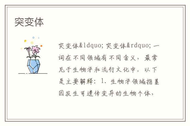 “突变体”一词在不同领域有不同含义,最常见于生物学和流行文化中。以下是主要解释: