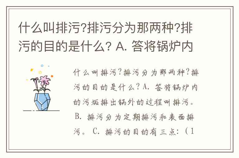 什么叫排污?排污分为那两种?排污的目的是什么? A. 答将锅炉内的污垢排出锅外的过程叫排污。 B. 排污分为定期排污和表面排污。 C. 排污的目的有三点:(1)降低锅水含盐量,避免发生汽水共腾,保证蒸汽品质;(2)排出积聚在过同和下集箱底部的泥渣、污垢;(3)当锅炉水位过高时,通过排污降低水位。