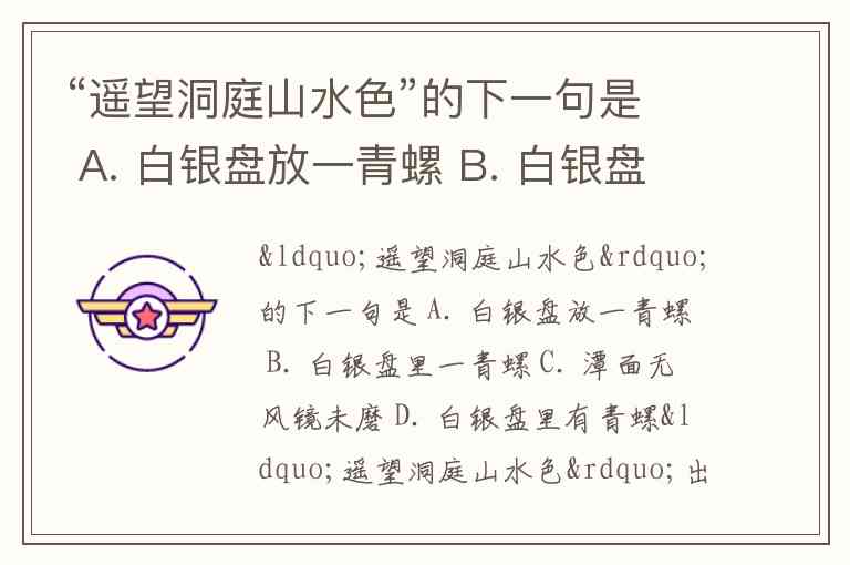 “遥望洞庭山水色”的下一句是 A. 白银盘放一青螺 B. 白银盘里一青螺 C. 潭面无风镜未磨 D. 白银盘里有青螺